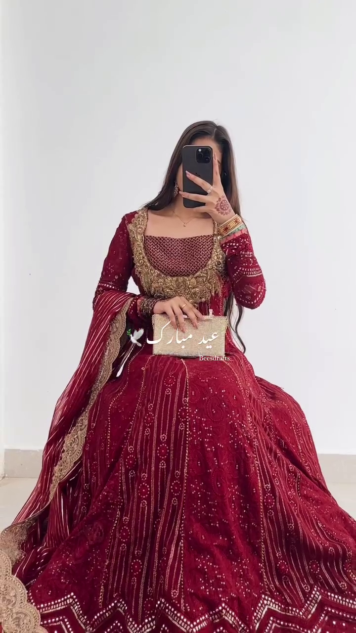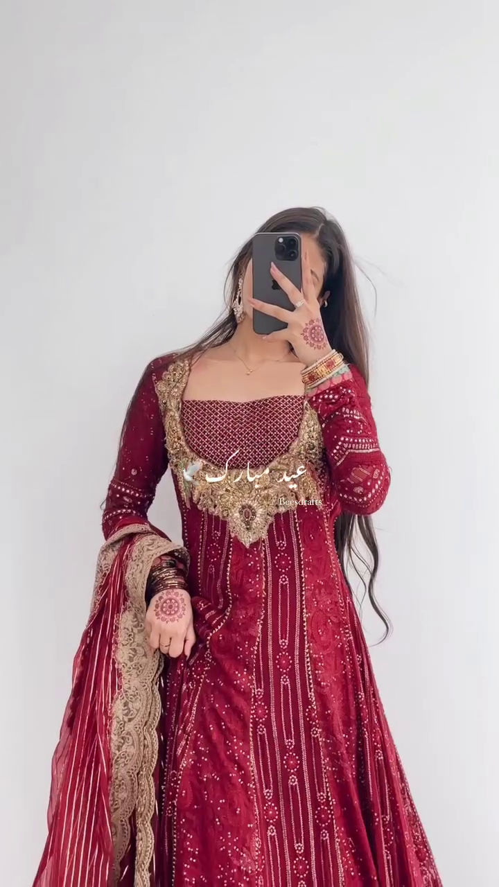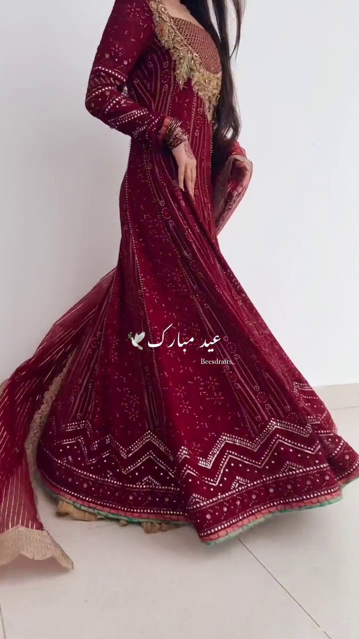 This deep red Anarkali is the ultimate representation of traditional bridal glamour ❤️. Heavily embroidered with golden zari, dabka, sequins, and mirror work, the rich maroon shade symbolizes love, elegance, and festivity. The craftsmanship reflects centuries-old artistry, making it a timeless piece for special occasions.